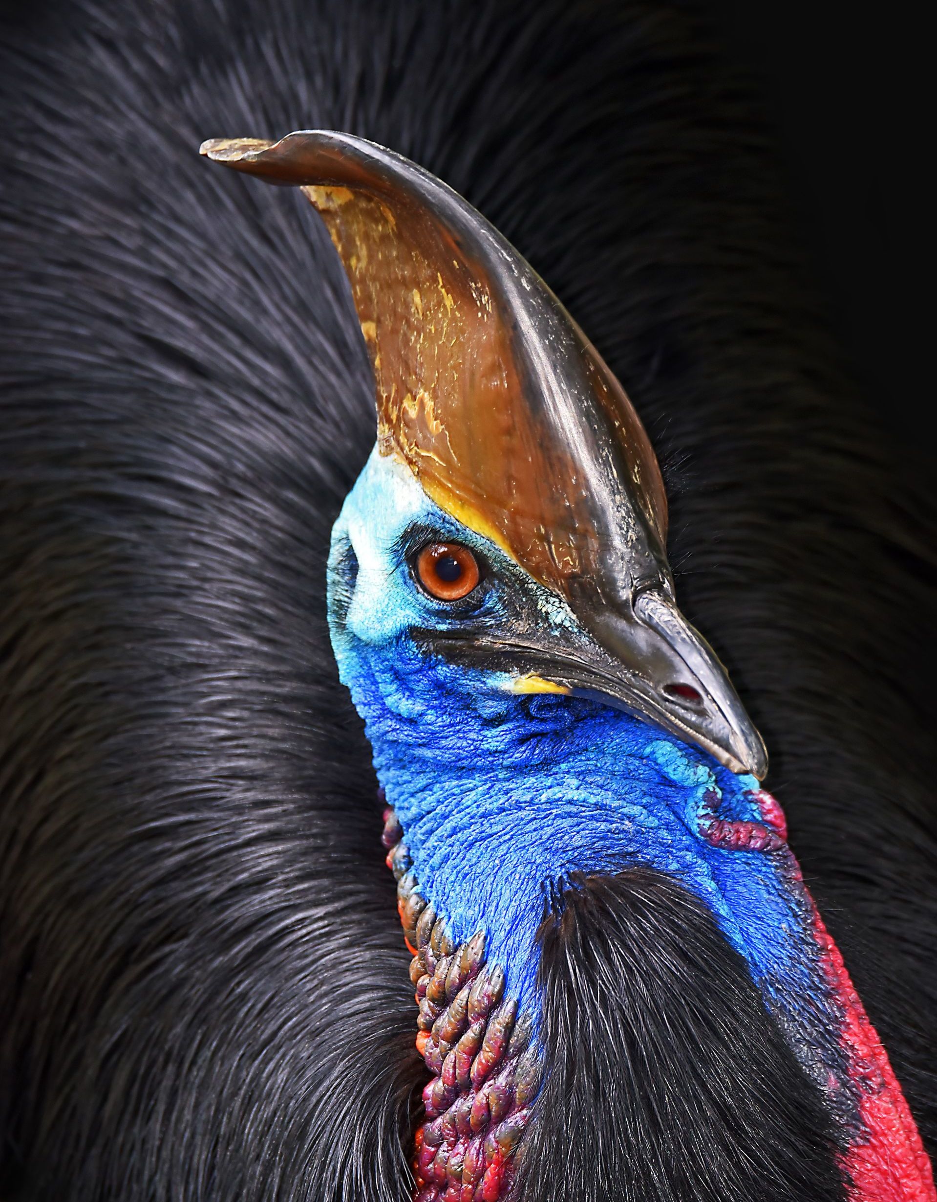 Adults: Body glossy and black with course plumage. A tall helmet or ‘casque’ on the head, made from keratinous material, and which grows with maturity. Skin on the face and neck is blue (red at rear of neck), and large, brilliant blue and red wattles hang from the front of the neck. Wattles may change colour according to the mood. Three forward pointing toes, of which the inner toe has a prolonged toenail, which can be used as a weapon. The female is larger, brighter and has a taller casque..