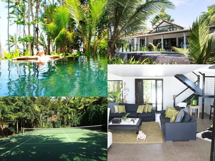 Coastal home with a horizon pool, tennis court, and timber deck for ultimate downtime.