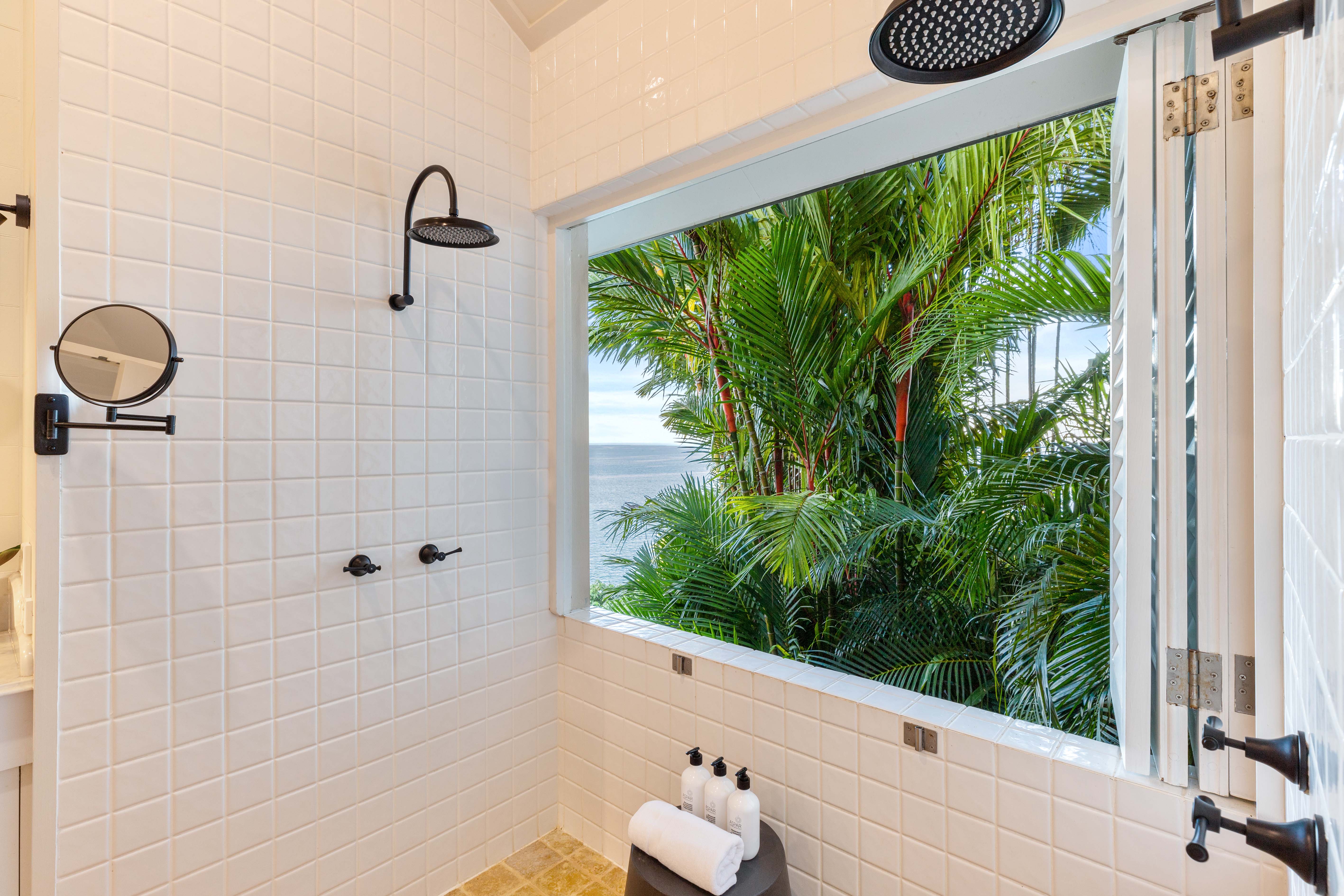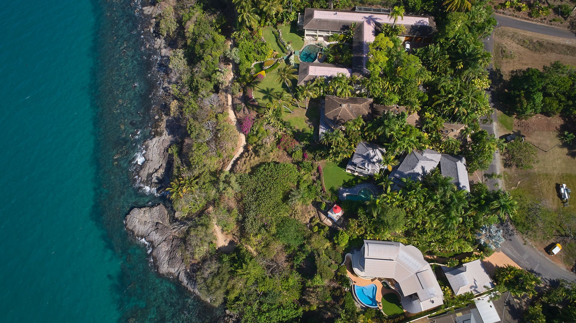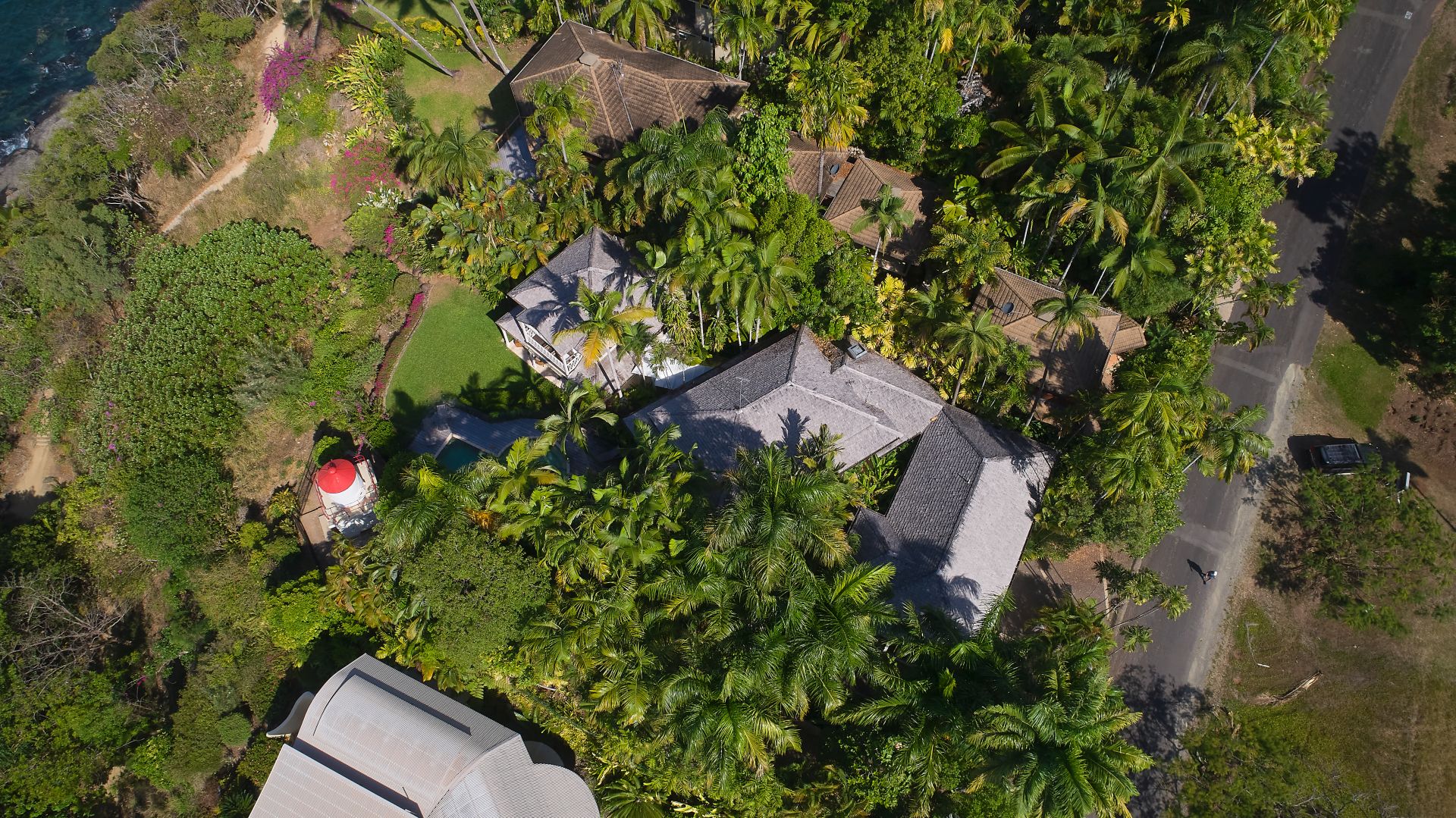 The ocean views are enhanced by the green grassy lawns with lush, tropical landscaping featuring exotic heliconias and vibrant red lipstick palms framing the edges of the property.